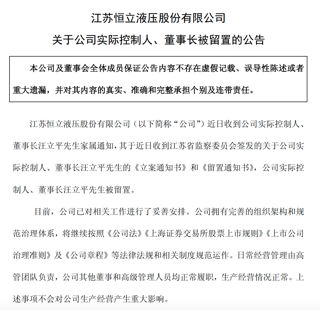 常州首富汪立平被留置,系千亿市值龙头恒立液压董事长生活