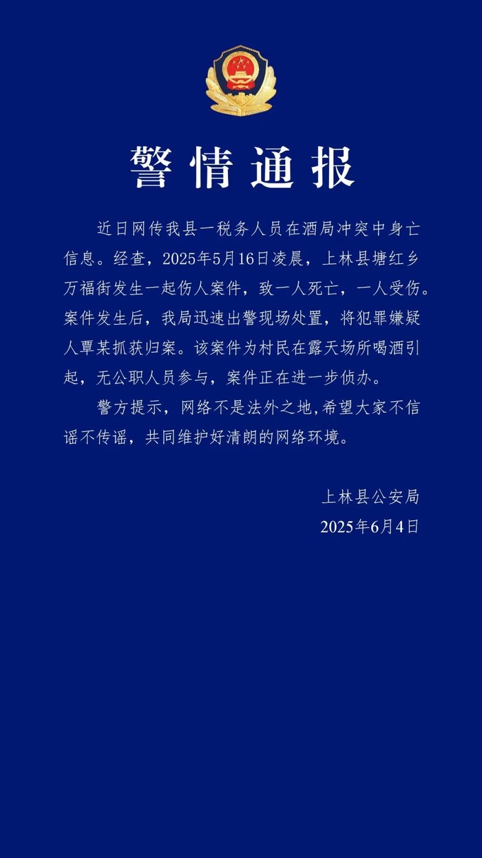 广西上林县公安局6月4日发布警情通报:近日网传我县一税务人员在酒局冲突中身亡信息。经查,2025年5...