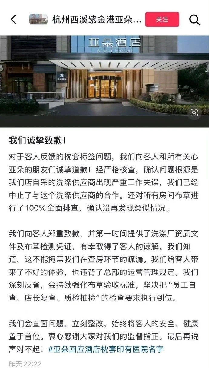 亚朵酒店就“枕套是医院用品”致歉:已中止与供应商合作生活