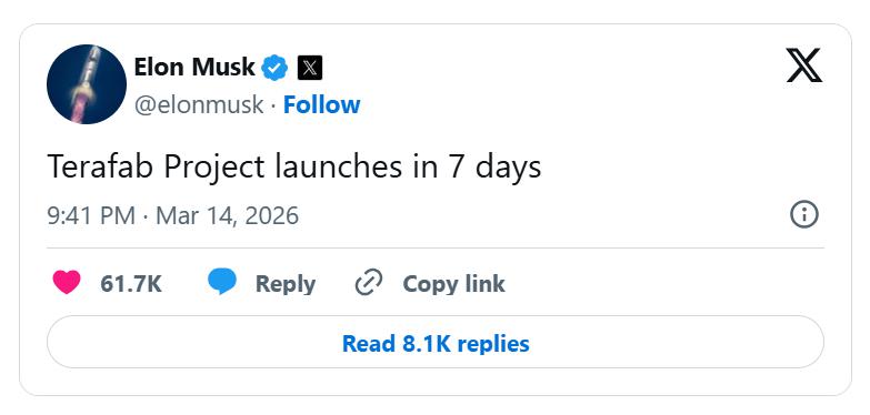 当地时间3月14日,特斯拉首席执行官马斯克宣布,公司的自主研发AI芯片制造项目Terafab工厂进入...