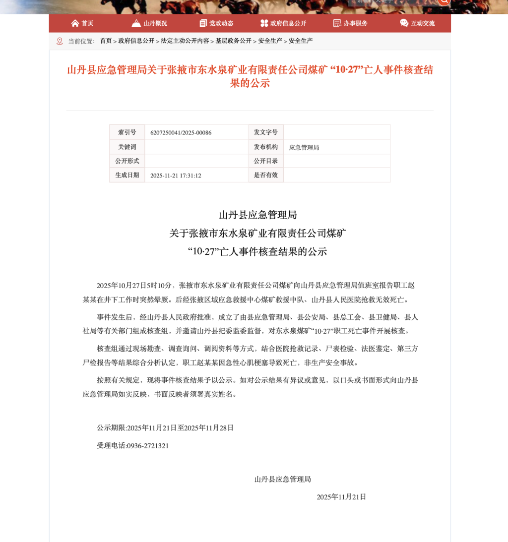 11月21日,甘肃张掖山丹县政府官网发布一则《山丹县应急管理局关于张掖市东水泉矿业有限责任公司煤矿“...