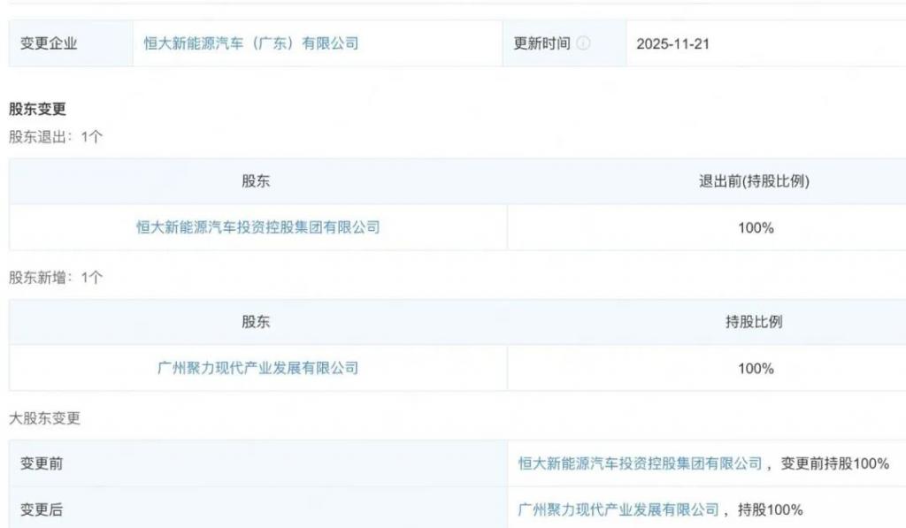 公开消息显示,近日,恒大智能汽车(广东)有限公司、恒大新能源汽车(广东)有限公司发生工商变更,原股东...