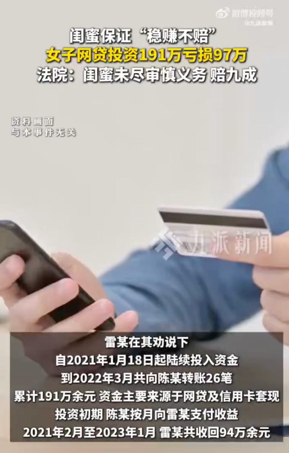 • 闺蜜推荐投资项目保证“稳赚不赔”,女子投资亏了97万,法院:闺蜜承担90%赔偿责任,约87万元