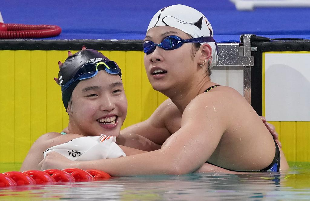 11月11日,河北队选手于子迪(左)在比赛后与浙江队选手余依婷拥抱致意。于子迪打破亚洲纪录获得冠军,...