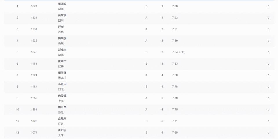 11月17日上午,全运田径大项结束了男子跳远预赛,湖南选手张溟鲲7米98排名第一,四川选手黄常洲7米...