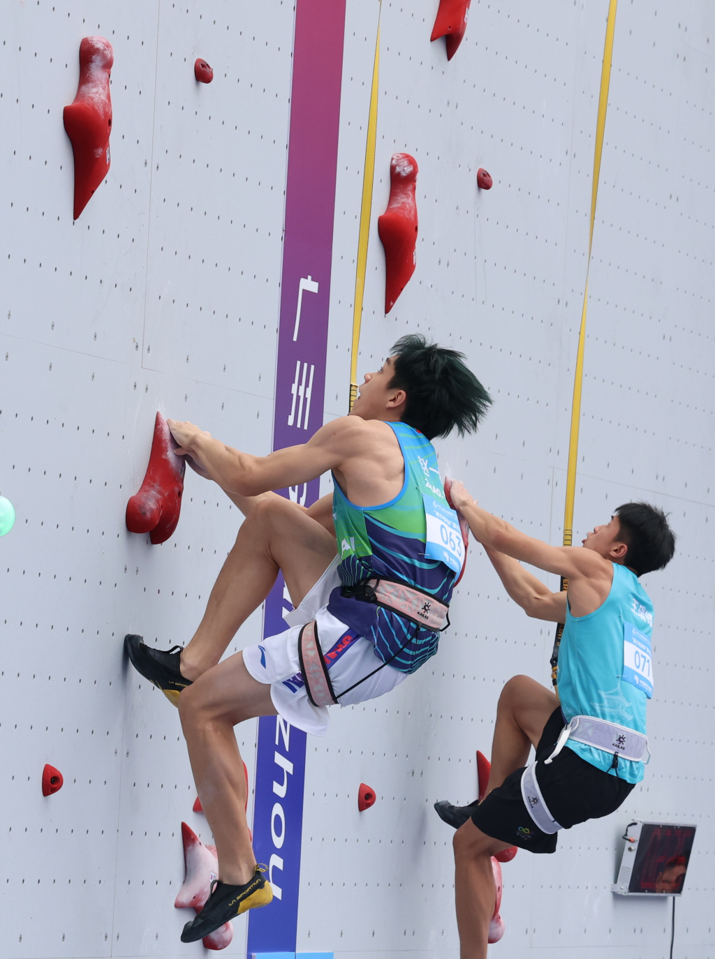 赵一程(左)在比赛中11月14日晚,广州大学城体育中心极限运动中心传来好消息,上海队赵一程以4秒86...