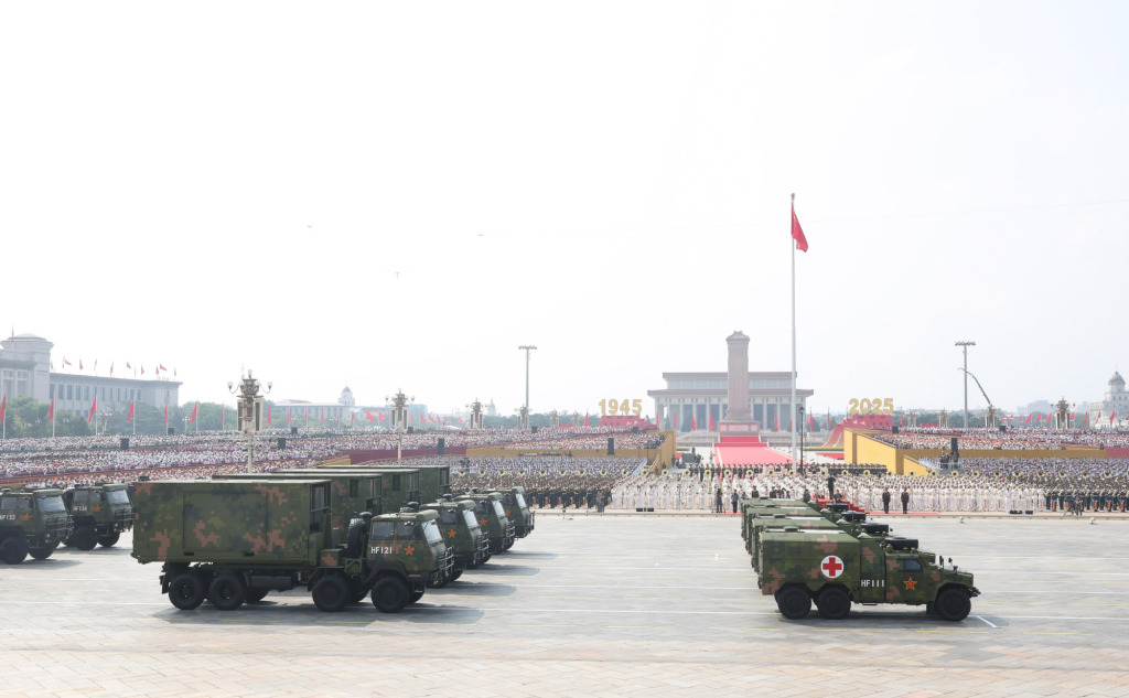 9月3日,纪念中国人民抗日战争暨世界反法西斯战争胜利80周年大会在北京隆重举行。这是装备保障方队接受检阅。 新华社记者 范培珅 摄