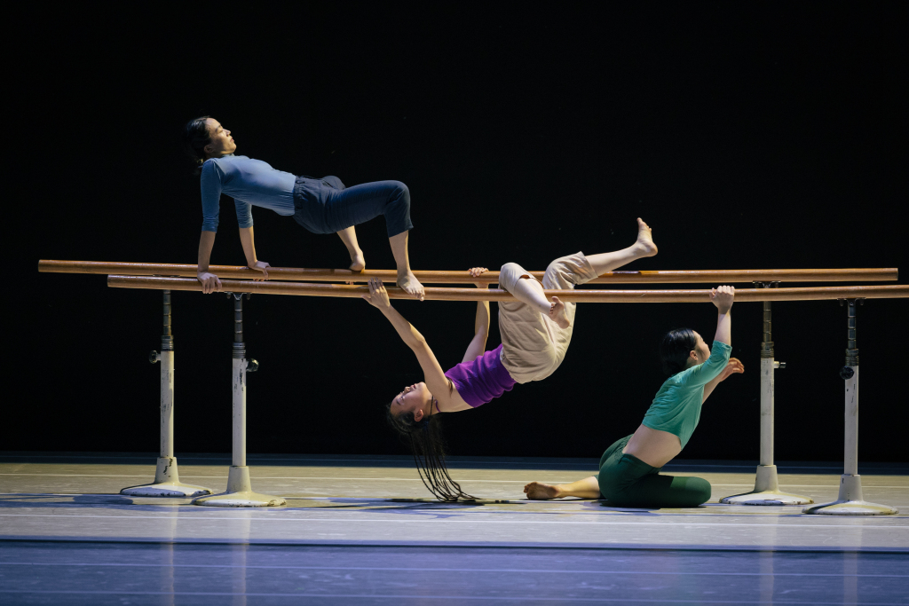 本届“双年展”中展演的《隐匿的风景》便是这样一部抽象化的作品。舞者的工作生活场景被化约为身体与器物的连接。镜子、把杆,这些排练厅中的常见之物成为舞者身体的拓展与延伸,但又规定着舞者的身体。而舞台上人与物、人与人之间的缠绕、离合,又可以进一步触发观者对于自我与他者、个体与集体的衍生思考,去感知被日常生活所隐匿的风景。
