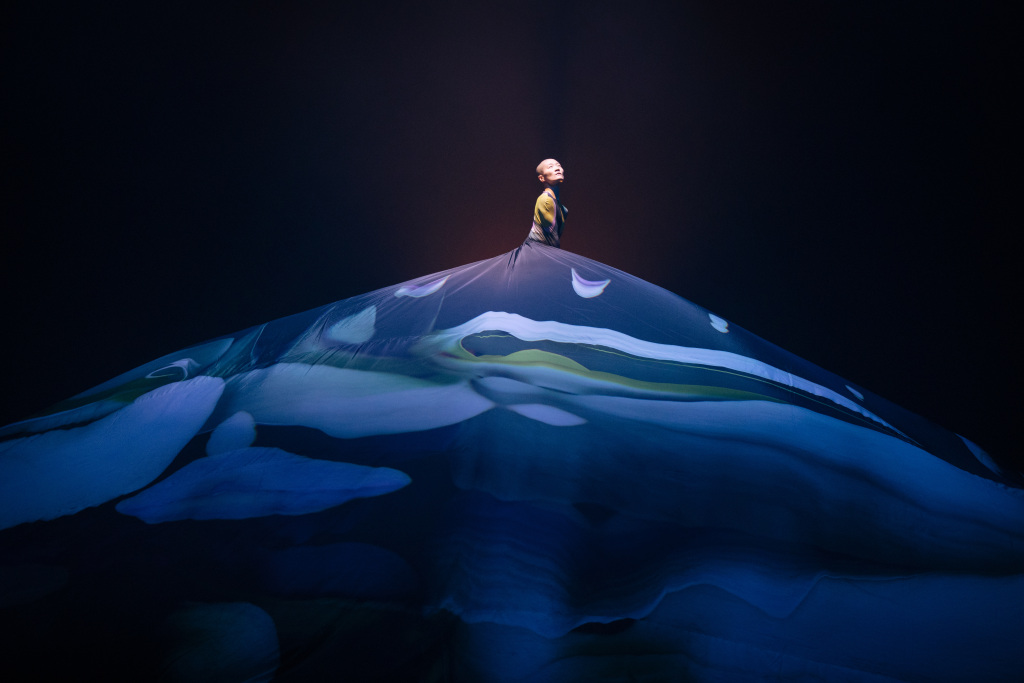 舞蹈的有趣之处还在于,它既是抽象的,但却又是直观的。毕竟任何言语与文字,都比不过身体的一次战栗。就像《神曲·少数·浅笑》,便以三种不同的身体姿态呈现出创作者的思考。《少数》用冷漠怪诞的身体形象去呈现生命中不堪时刻所带来的伤害。《浅笑》则以拈花一笑的姿态,传递出超然面对伤害的生命力量。而《神曲》则上演了一出极致的身体表演。高台之上,绵延整个舞台的无边长裙束缚住舞者的手足,静默、肃穆、坚定。舞者的每一次微妙肢体舞动,都仿佛神明低语,唤醒观者内心那份对超越性的追求。