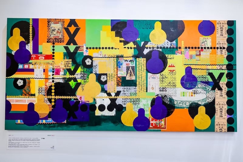 贝家骧的作品边上,则是德庭创想的展位,呈现的是艺术家邵毓挺以ART DECO融合海派历史元素的综合材料作品。邵毓挺曾利用业余时间,收集了许多老上海的广告、账单、包装、店招、月份牌、宣传单张等与海派文化、上海城市发展历程紧密联系的物品。如今,他以拼贴的方式,将自己收藏的月份牌、宣传单、票据等融入进绘画里。邵毓挺告诉记者,自己的收藏是创作的素材,将这些物品放入绘画中,形成“寻梦与重构”的主题。