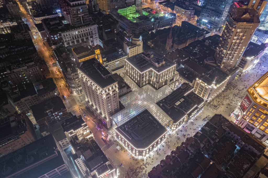 从空中俯瞰,外滩·中央以十字形玻璃穹顶将四组历史建筑有机串联。图片来源:华东建筑设计研究院
