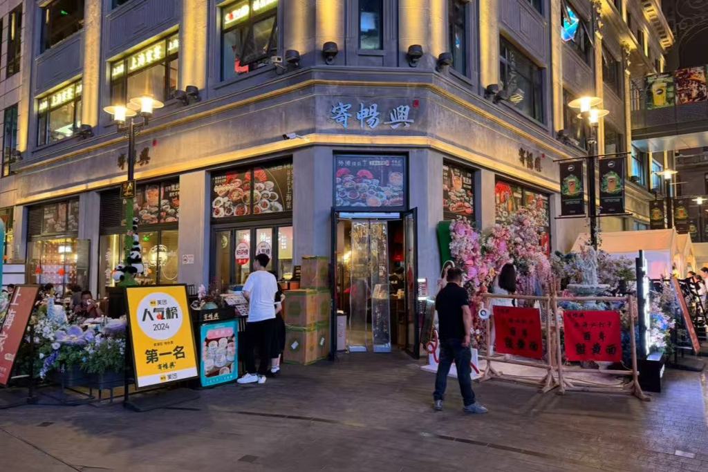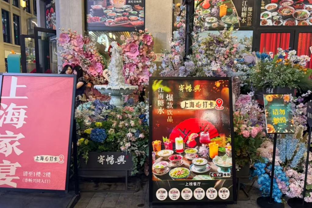 在点评软件上搜索外滩美食,会发现排名靠前的很多店来自外滩·中央,这些餐饮店通过争奇斗艳的外摆招徕顾客、展示形象。以黄浦区大闸蟹热门榜排行第一的寄畅興·百年蟹黄面为例,其外摆被顾客形容为把莫奈花园搬到餐厅,印象派的斑斓配色、南法风的许愿池、铺着粉色玫瑰花瓣的大理石,在这一圈外摆的外圈,店家进一步向街区拓展经营空间,印在KT板上的各种荣誉的冠冕密密麻麻摆了一圈,成为外摆的外摆——“黄浦区特色菜美团人气榜2024第一名”、“抖音生活服务2025心动榜餐厅”、“CCTV推荐”“上海必打卡”。多数店铺人均消费普遍在百元左右,让外滩餐饮告别了“要么很贵、要么太便宜”的两极分化。店家告诉研究员,在高峰时段,用餐须排队约40分钟,一晚可以翻牌数次,许多店直到晚上9、10点钟仍人满为患。值得注意的是,由于历史建筑位于场地到四角,就整个场地而言,底层餐饮店的“繁华竞逐”仅是局部热闹的“镶边”,这一近4000平米的“气孔”,亟待进一步的优化提升。