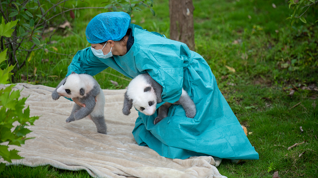 9月6日,成都大熊猫繁育研究基地,今年出生的熊猫幼崽在饲养员精心照料下公开亮相。