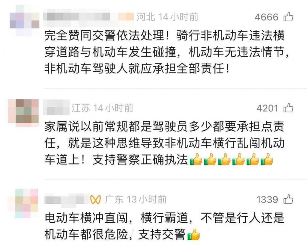 不料女子家属到来后,不服判决还质疑," 以前驾驶员多少都要带点责任的 "。交警回应称,"人人都这样想,驾驶员还怎么开车?自行车横过机动车道,必须下车推行,有违法行为的一方,就要承担事故的全部责任。"