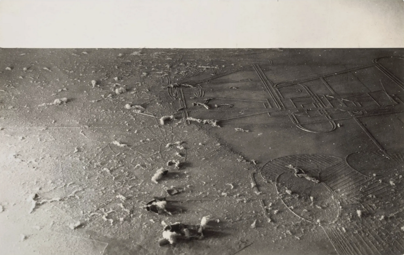 他还探索了时间的延续和尺度的变化。例如,他聚焦于杜尚创作中的作品《新娘,甚至被单身汉们剥光了衣服》(The Bride Stripped Bare by Her Bachelors, Even (The Large Glass))中的一小部分,并在昏暗的光线下将相机光圈打开数小时,记录玻璃板上积聚的灰尘。这幅名为《尘埃滋生》(Dust Breeding)的特写照片,如同一幅干旱景观的鸟瞰图。