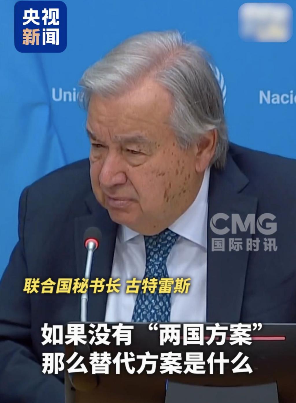 古特雷斯反问道,如果没有 " 两国方案 ",替代方案是什么?难道是一个国家的人民被剥夺基本权利吗?难道是一个国家、一方人民被从他们的土地上驱逐吗?