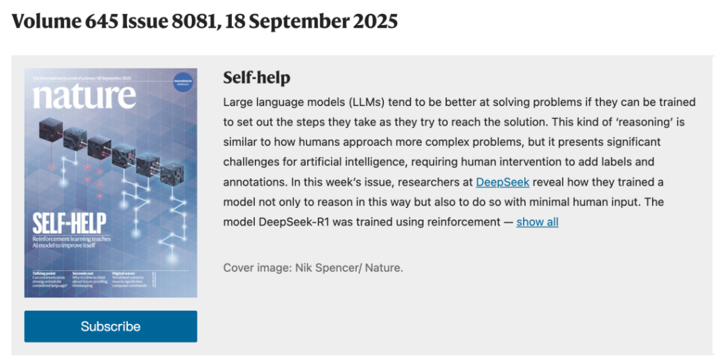 9月18日,梁文锋带着DeepSeek-R1的研究,登上最新一期国际顶级期刊《自然》(Nature)封面。