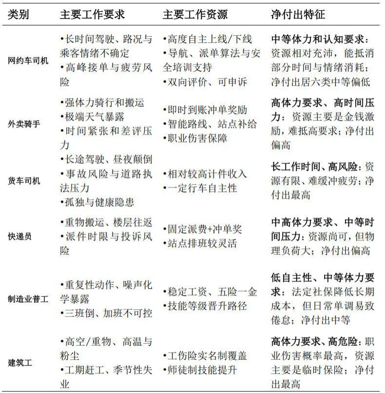 报告还比较了不同蓝领岗位的净付出,即工作要求与工作资源的比较。工作要求越高、工作资源越少,则该职业的净付出越重。总体而言,网约车司机的净付出属于中等偏低水平。