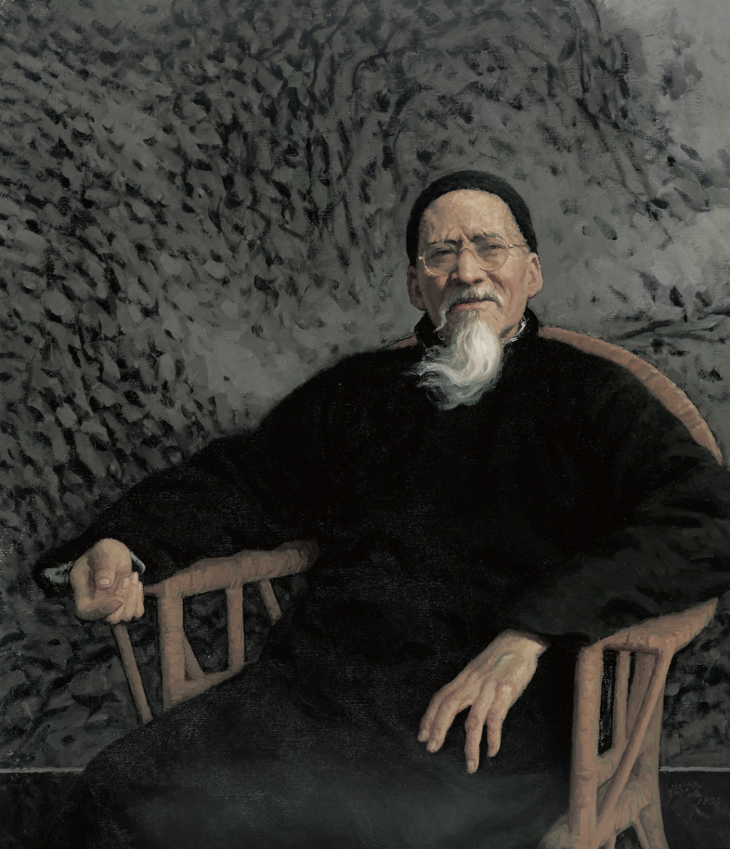 91岁高龄的老艺术家靳尚谊也将亲临画展现场。观众可以在展厅看到他的多幅代表作。其中《黄宾虹》这幅作品以写实的手法塑造了国画大家黄宾虹的文人风骨。画面色调沉稳,光影层次细腻,突出人物深邃神态与淡泊气质。笔触含蓄而有力,融合西方古典油画的厚重与中国传统笔墨的意境,既具肖像的实体感,又传达出东方文化精神的内在韵律。