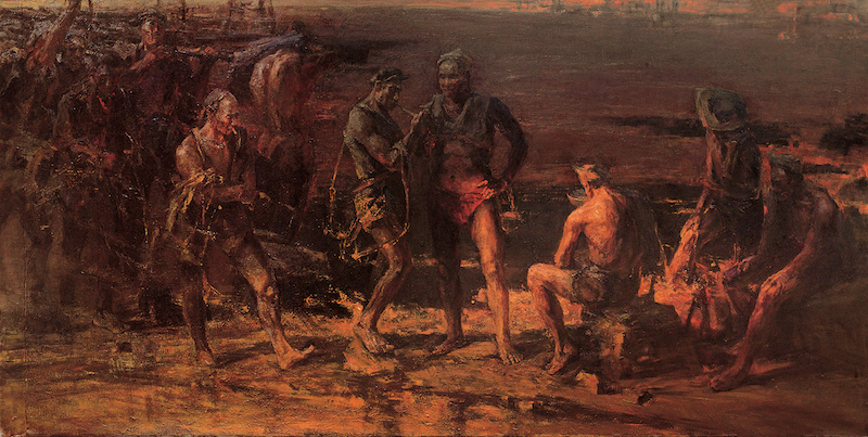 已故画家钟涵曾多次至黄河写生,黄河是他的艺术母题,他的作品《望中犹记晚潮明处》描绘船工们在黄河晚潮时分的夕阳斜影中劳作的身影,通过景深的处理突出船工们高大伟岸的身姿,运用鲜艳浓烈的桔红色烘托出夕阳西下的画面氛围,表现出船工们生生不息的生命力。