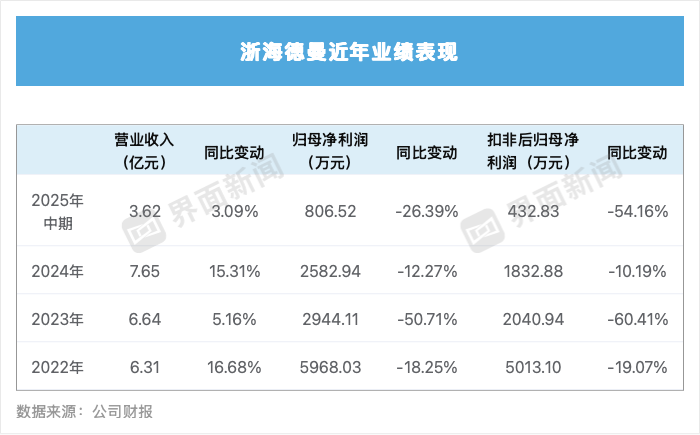 今年上半年,浙海徳曼实现营业收入3.62亿元,同比下降3.09%;归属上市公司股东的净利润806.52万元,同比下降26.39%;归属于上市公司股东的扣除非经常性损益的净利润432.83万元,同比下降54.16%。