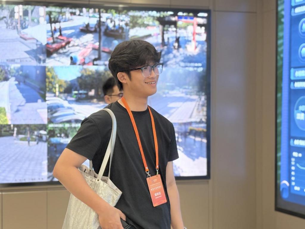 印尼网红博主在西安城墙数字方舱综合管理平台认真观看城墙监测数字大屏