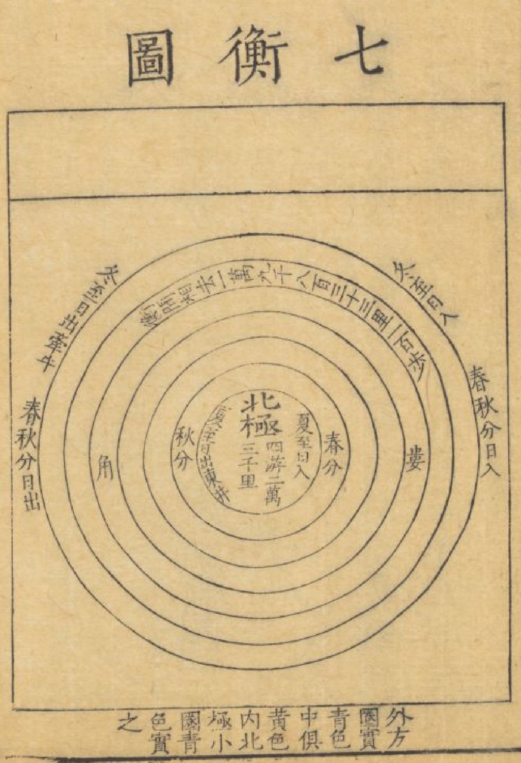 “七衡”以北极为圆心,每一衡表示太阳在十二中气日的运行轨道。《周髀》定观测点周地(洛阳或后世亦视为“地中”的登封告成“周公测景台”)是距北极10.3万里之处,而人眼所能看到的日月星辰的范围(同时也是这些天体的光照范围)是16.7万里。因此在一天之中,当北极—周地—太阳连成一线之时,太阳离周地最近,是周地正午;半天之后,太阳—北极—周地连成一线,太阳离周地最远,远超人眼所及,是周地午夜。夏至日时,太阳在半径11.9万里的内衡(离北极圆心最近的圆)一天绕一周,北极璇玑附近始终在光照范围之内,所以全天都能见到太阳,现代科学称之为极昼现象。故赵爽注《周髀》“北极之左右,物有朝生暮获”云:“北极之下,从春分至秋分为昼,从秋分至春分为夜。”