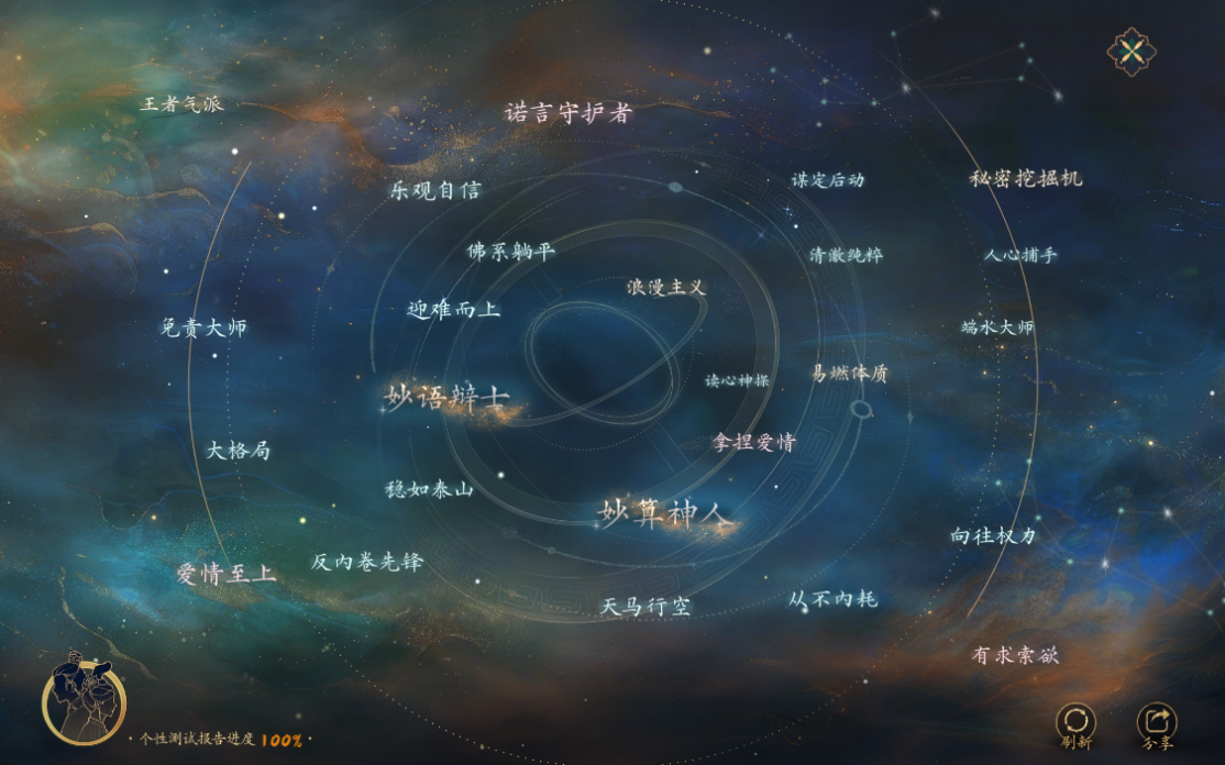 开发团队引入的“东方版MBTI”个性测试系统,则提供了第三重视角。这个系统指的是,每一章结束后,系统会根据玩家选择生成一个个性化图谱,用一些词汇描述玩家的行为倾向。表面上,这是贴近年轻受众的市场策略,但在游戏内部,这套设计其实承担着“人格化权力”的功能。它暗示宫廷中的生死与选择,都是个人性格的必然结果,而不是制度性压迫的产物。这样的处理延续了女频网文的逻辑,即在庞大的权力秩序下,个体仍能通过自身特质决定自己、他人,乃至王朝的命运。试图通过人格化来缓冲情感叙事与冷酷机制的矛盾。但在《盛世天下》里,结果却适得其反——因为人格测试强调的是“你是谁”,而游戏机制不断提醒“无论你是谁都要死”。这种落差非但没有消解矛盾,反而让矛盾更加显眼。