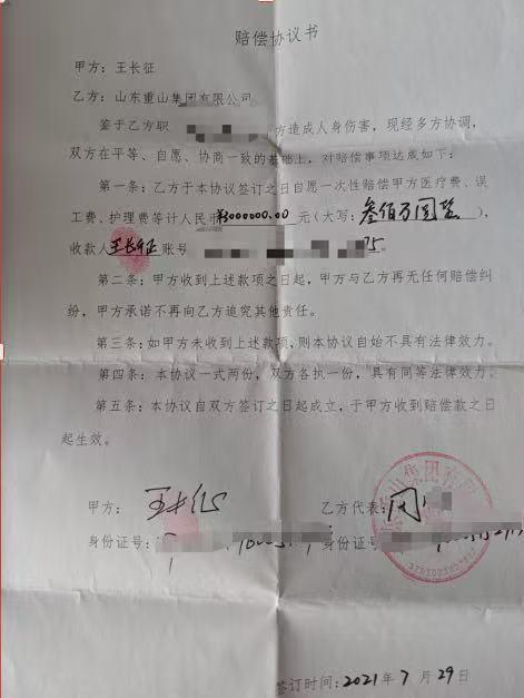 2021 年 7 月 29 日,王长征与重山集团签署的赔偿协议书。受访者供图