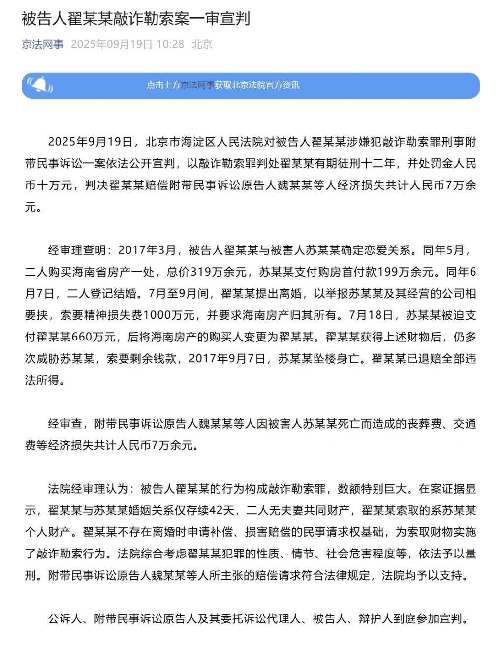 9 月 19 日上午,北京市海淀区人民法院对被告人翟某某涉嫌犯敲诈勒索罪刑事附带民事诉讼一案依法公开宣判,以敲诈勒索罪判处翟某某有期徒刑十二年,并处罚金人民币十万元,判决翟某某赔偿附带民事诉讼原告人魏某某等人经济损失共计人民币 7 万余元。