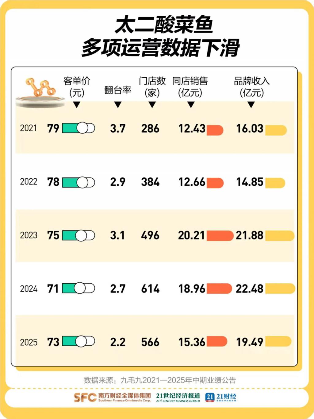 2019 年巅峰时期,太二酸菜鱼的翻台率高达 4.9 次 / 天,一度超过以服务著称的海底捞,成为行业效率标杆,客单价也一度冲上 80 元,成为母公司九毛九集团当之无愧的 " 增长引擎 "。然而,截至 2025 年中报,太二的翻台率下跌至 2.2 次 / 天,客单价降至 73 元。