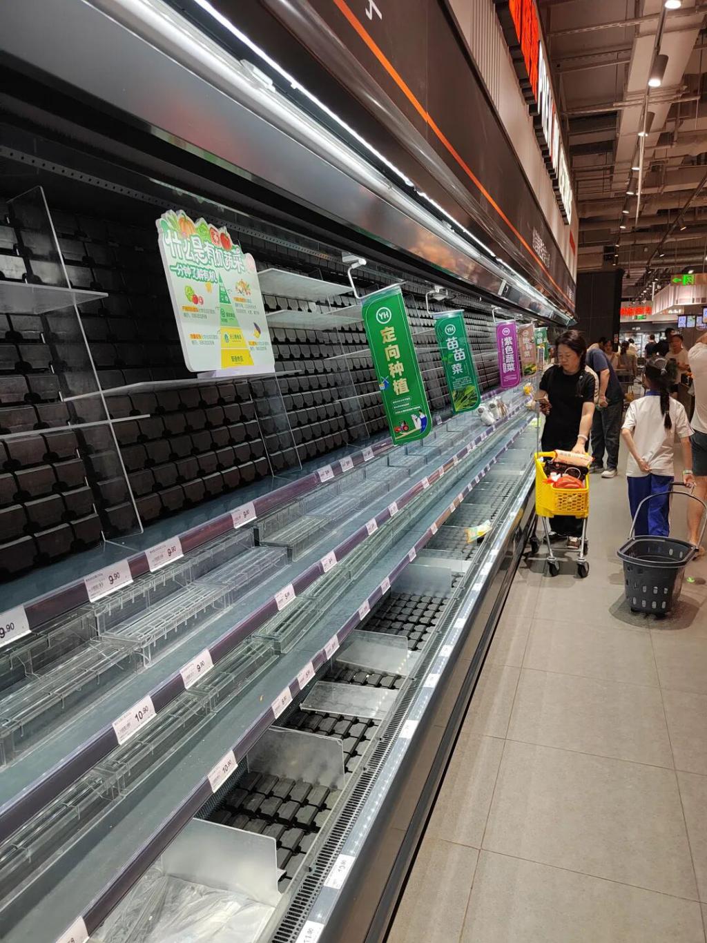 9 月 22 日晚间,顶端新闻记者在深圳市罗湖区一家永辉超市看到,前来购物的人络绎不绝。在蔬菜区、熟食区,部分货架已经被买空。馒头、包子等主食也所剩不多。熟食区一位售货员说,今天(9 月 22 日)上午就开始有很多人购物囤货。