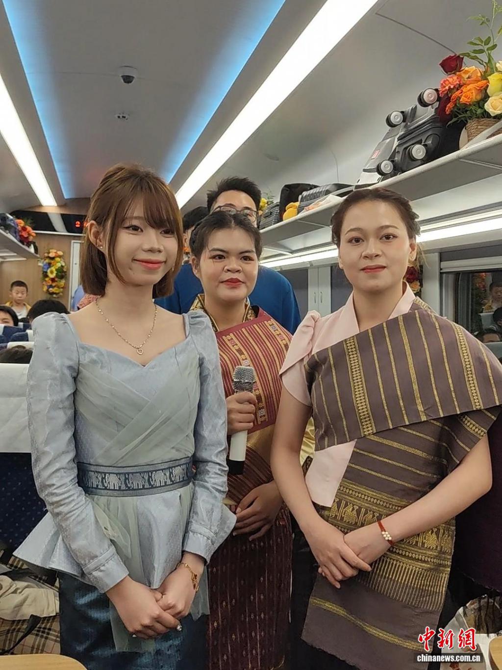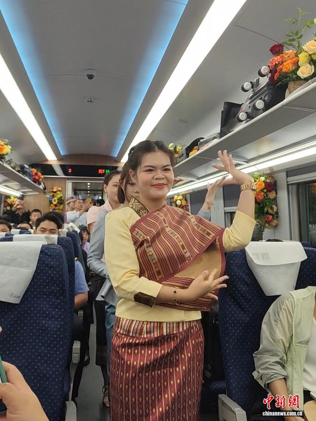 老挝留学生吉姆握着话筒,用略带口音的中文向车厢内的旅客问好。她身着一袭流光溢彩的传统服饰,站在 C9521 次中老铁路国际列车的走道中央,笑意粲然。窗外,云南山水如画卷般缓缓掠过。