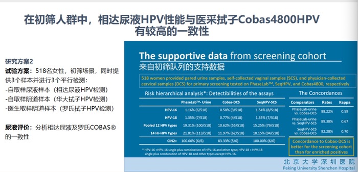 在518名女性中,针对14种高位HPV型别的检出率,相达尿液检测为21.81%,罗氏拭子为11.97%。