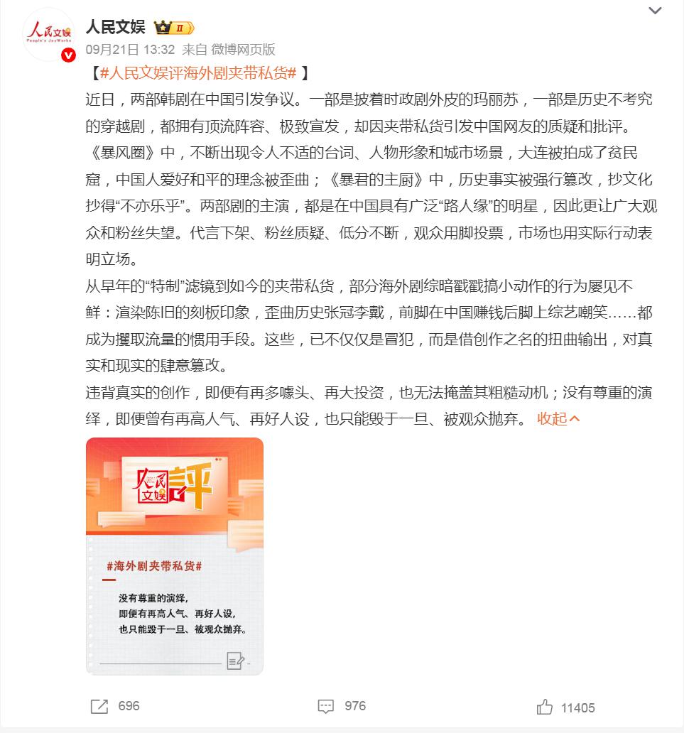 人民文娱在评论中称,《暴君的主厨》中,历史事实被强行篡改,抄文化抄得 " 不亦乐乎 "...... 从早年的 " 特制 " 滤镜到如今的夹带私货,部分海外剧综暗戳戳搞小动作的行为屡见不鲜:渲染陈旧的刻板印象,歪曲历史张冠李戴,前脚在中国赚钱后脚上综艺嘲笑 …… 都成为攫取流量的惯用手段。这些,已不仅仅是冒犯,而是借创作之名的扭曲输出,对真实和现实的肆意篡改。