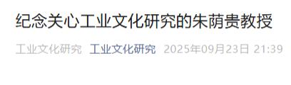 9 月 23 日晚,华中师范大学中国工业文化研究中心官方微信发文《纪念关心工业文化研究的朱荫贵教授》表示悼念。