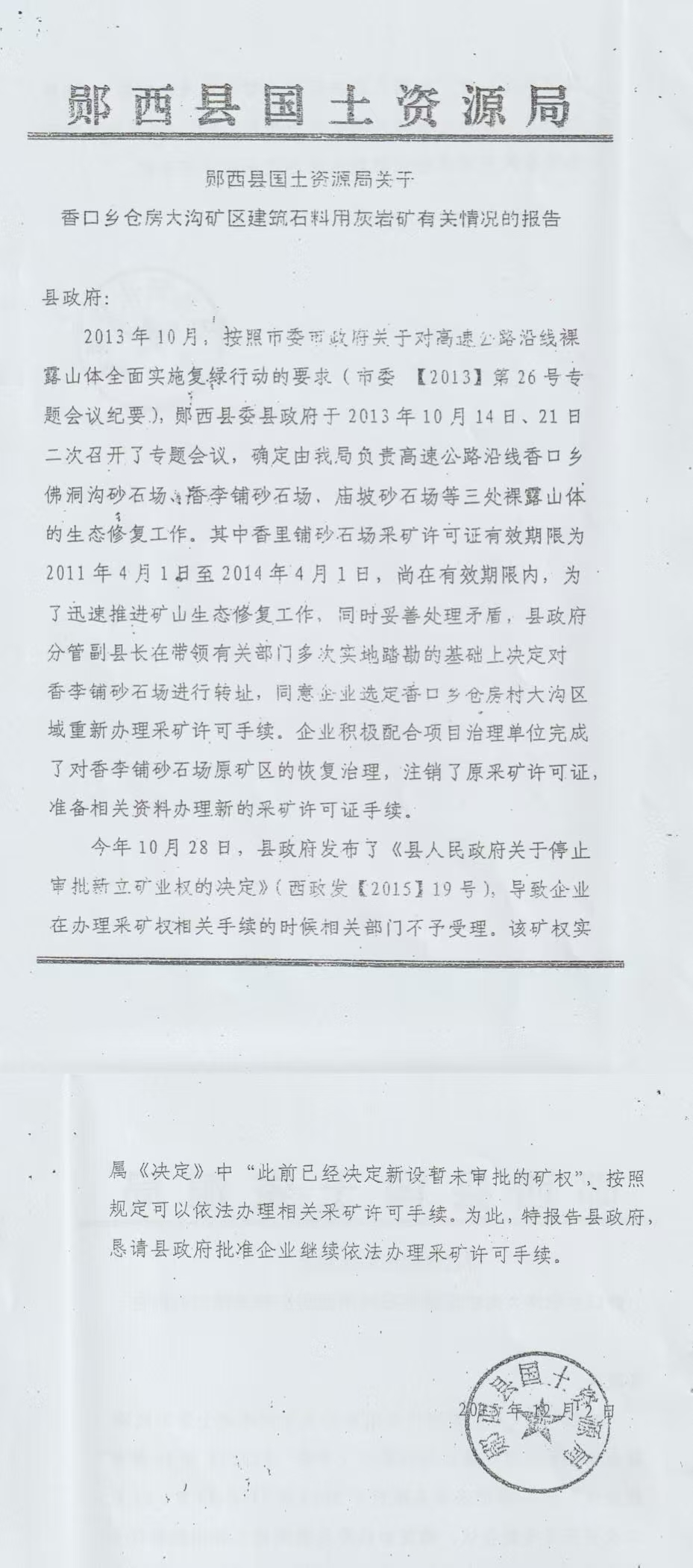 2015年12月,郧西县国土资源局在一份向县政府上报的《香口乡仓房大沟矿区建筑石料用灰岩矿有关情况的报告》称,香李铺砂石场积极配合项目治理单位完成了对香李铺砂石场原矿区的恢复治理,注销了原采矿许可证,准备相关资料办理新的采矿许可证手续。2015年10月28日,县政府发布了《县人民政府关于停止审批新立矿业权的决定》,导致企业在办理采矿权相关手续的时候相关部门不予受理。该决定中“此前已经决定新设暂未审批的矿权”,按照规定可以依法办理相关采矿许可手续。