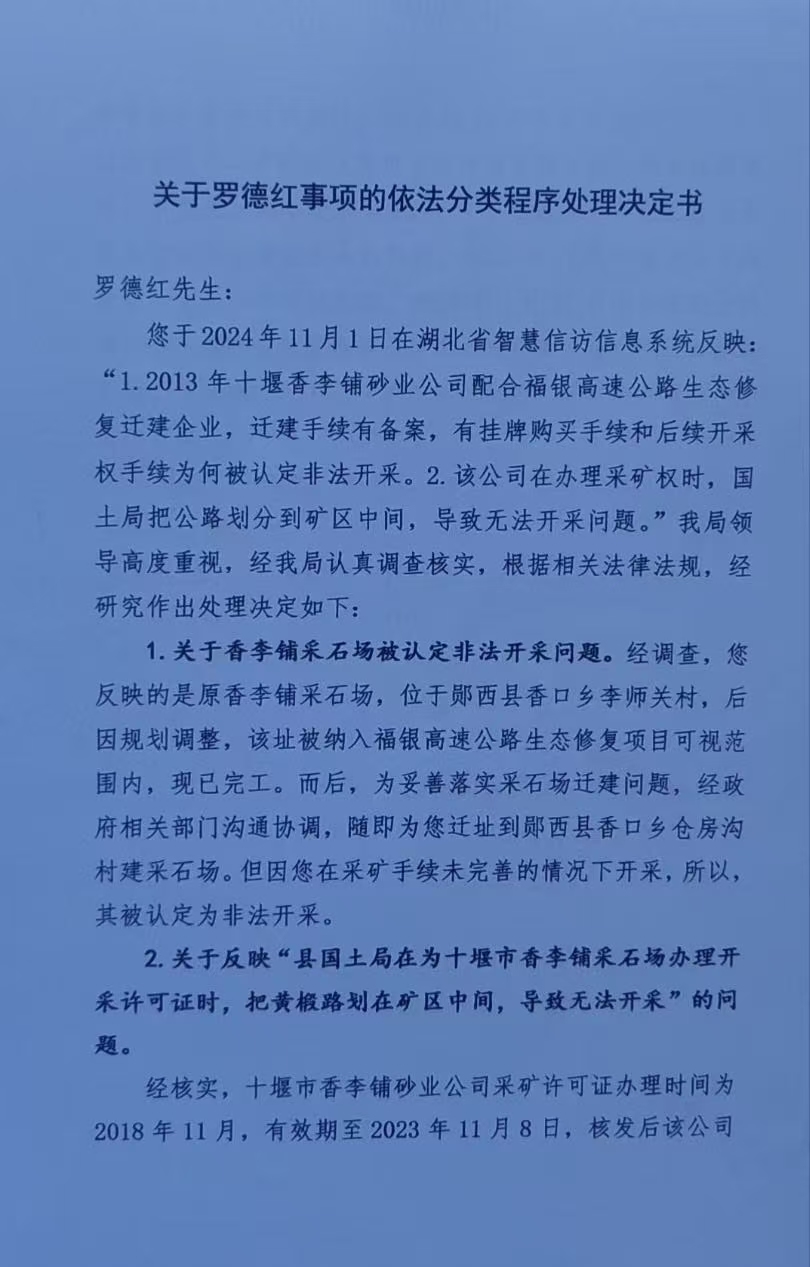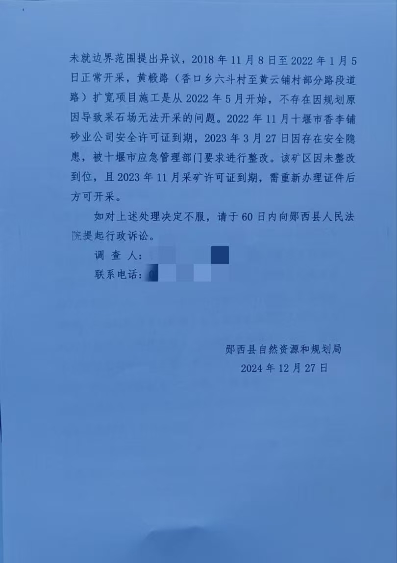 2023年8月,郧西县人民政府信访事项复查委员会办公室在一份《信访事项复查意见书》中表示,经查,香李铺砂业公司采矿许可证办理时间为2018年11月,有效期为2023年11月8日,核发后该公司未就边界范围提出异议,香口乡六斗村至黄云铺村部分路段道路扩宽项目施工建设时间是从2022年5月开始,不存在规划错误的问题。