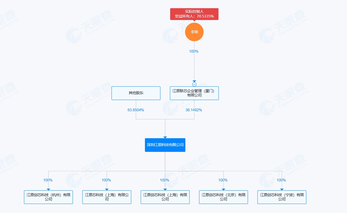 通过天眼查APP股权穿透,江原科技实控人为李瑛,其通过江原联芯企业管理(厦门)有限公司等持有公司约70%股权。