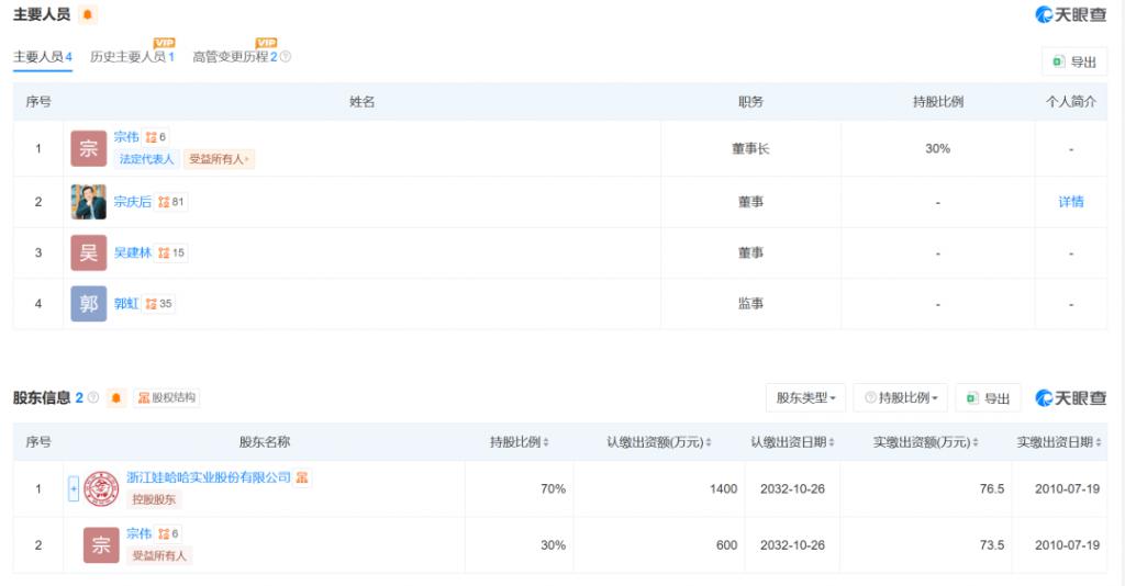由浙江娃哈哈实业公司(娃哈哈实业)持股 70% 的子公司上海娃哈哈饮用水有限公司成立于 2002 年,是 " 娃哈哈 " 桶装水在上海地区的独家经营实体,全面负责上海地区 " 娃哈哈 " 桶装水的生产、销售和委托外部加工,上海娃哈哈饮用水有限公司的董事长、法定代表人宗伟也是股东之一,持股 30%。