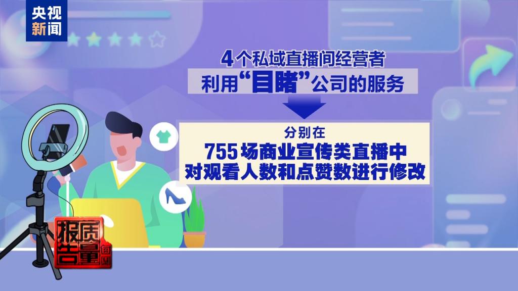 调查还显示,共有 4 个私域直播间经营者利用 " 目睹 " 公司的服务,分别在 755 场商业宣传类直播中对观看人数和点赞数进行了修改。