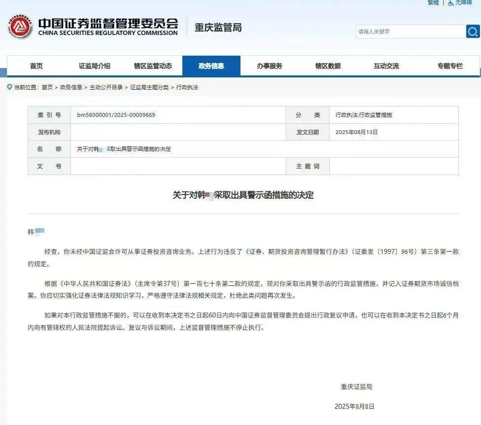 目前,该工作室已被重庆市场监督管理局列入 " 经营异常名录 "。重庆证监局也认定韩某确实存在非法推荐股票的行为,并且对她出具了警示函。