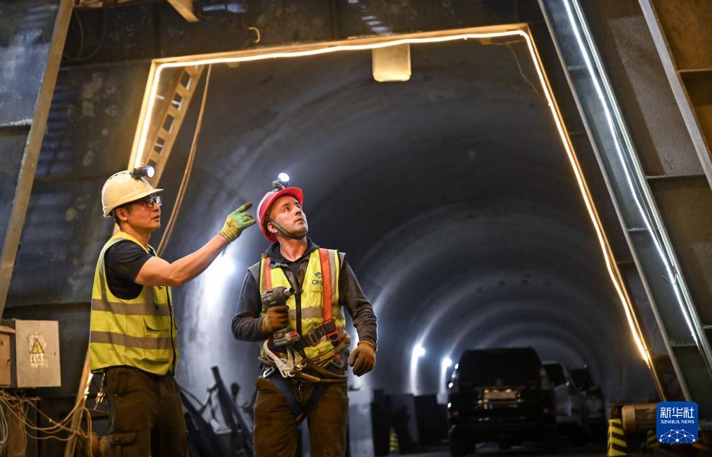9 月 11 日,一名中方员工(左)在塔吉克斯坦卡拉依洪姆村附近的中塔公路二期工程 1 号隧道施工现场指导塔方员工。 新华社记者 李任滋 摄