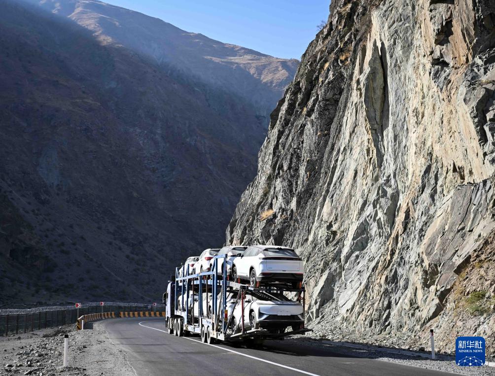9 月 11 日,一辆载有中国品牌汽车的笼车行驶在塔吉克斯坦卡拉依洪姆村附近的中塔公路二期路段上。 新华社记者 李任滋 摄