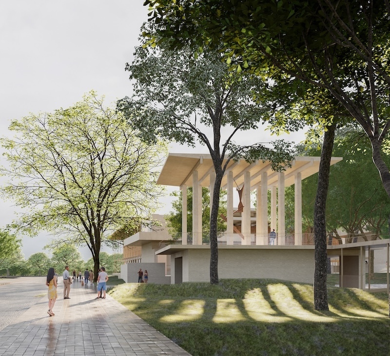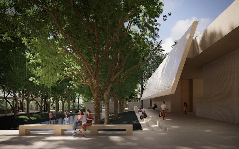 而坐落在林荫道尽头的户外展示地“戏台”则回应了中国传统戏台的建筑样式,它作为一个半开放的户外展厅,链接起美术馆内外的建筑空间,吸引着花园内外观者的目光。在此处,美术馆将呈现艺术家野口勇(Isamu Noguchi)的雕塑作品。
