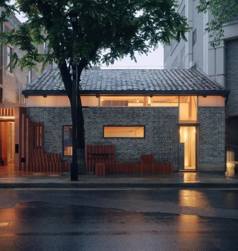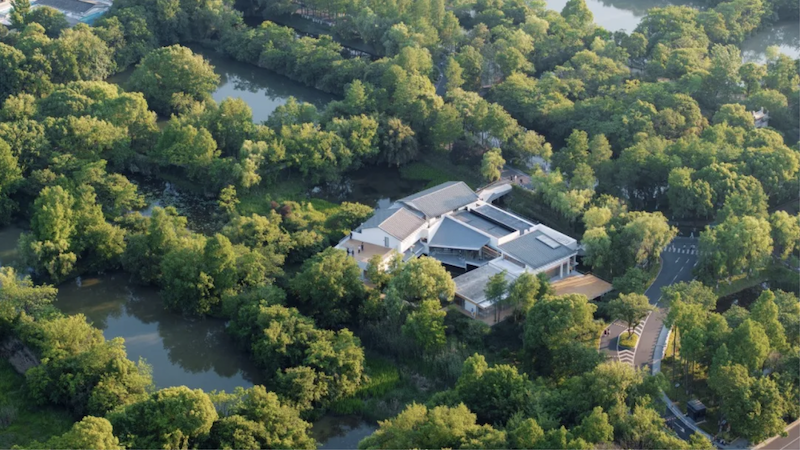 而在杭州西溪湿地公园的北端,由紋建筑事务所设计的水榭书店,则是一个将过去的办公楼建筑转化为文化空间的案例,以U型的布局,实现拆解与重构。
