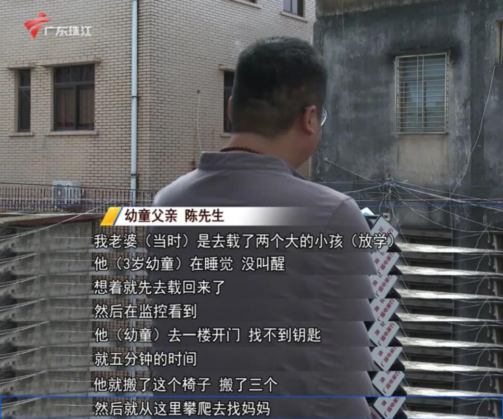 准备回家的邻居陈招娣恰好路过,抬头就看见小孩 " 半天吊 ",立刻呼喊周围人过来帮忙。" 看到小孩在楼顶阳台上挂着,当时我也不对劲,我也不知道怎么办,脑子空空的,就第一时间喊人。"