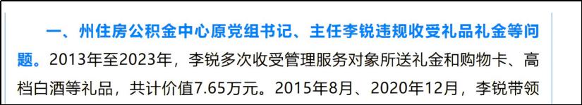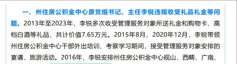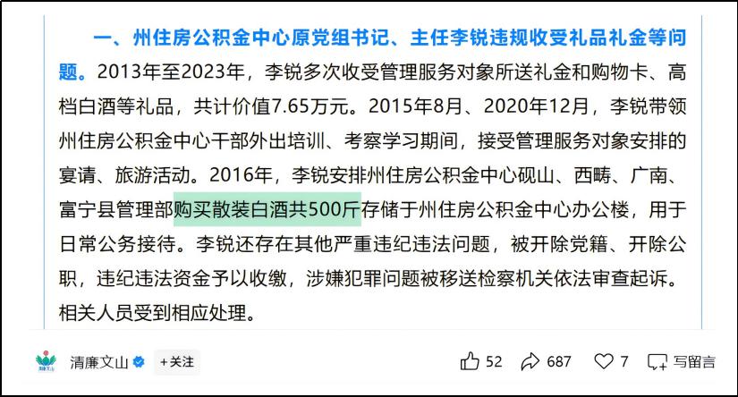 通报里说,2016 年,时任州住房公积金中心主任的李某,让下面几个县的管理部买了 500 斤散装白酒,存放单位办公楼里,平时用来招待客人。