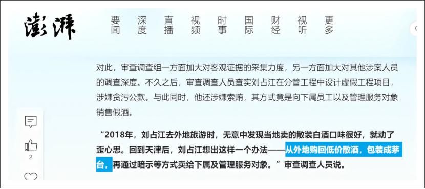 2018 年,刘某某从外地低价采购散装白酒,包装成 " 茅台 " 等高档酒,向下属及管理服务对象销售牟利。