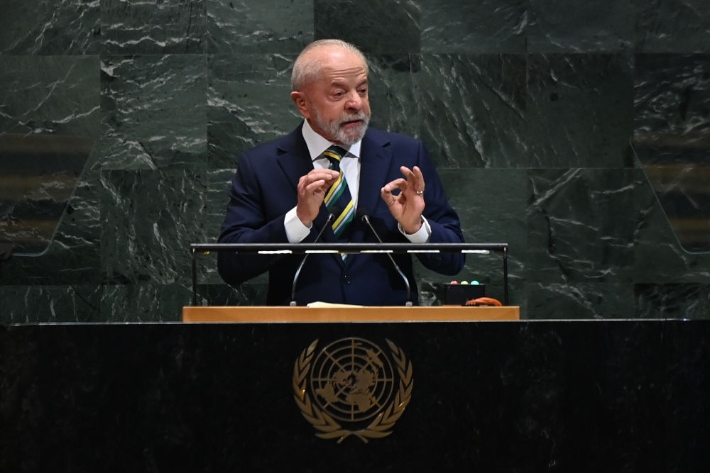 9月23日,在位于纽约的联合国总部,巴西总统卢拉出席第80届联合国大会一般性辩论时发表讲话,强调国际社会应捍卫多边主义和民主制度、反对单边制裁和干涉主权国家,并呼吁维护拉美地区和平。新华社记者 李睿 摄